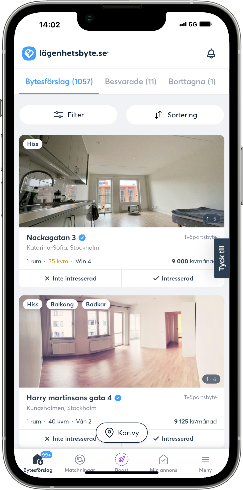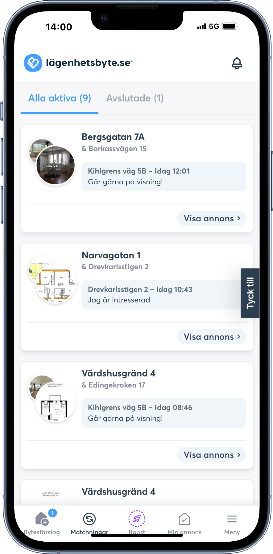 Matchningar där alla parter i bytet visat intresse finns nu på sidan Matchningar. Här kan du skicka meddelanden till alla parter i matchningen för att få mer information om lägenheten och boka in tid för visning. Detta skapar en bättre överblick och hjälper dig hålla fokus på dina matchningar.